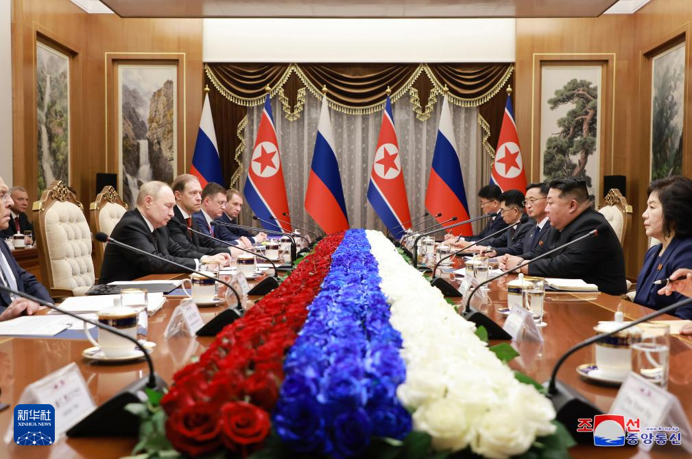 6月19日,在朝鮮平壤,朝鮮勞動黨總書記、國務委員長金正恩與俄羅斯總統(tǒng)普京舉行會談。